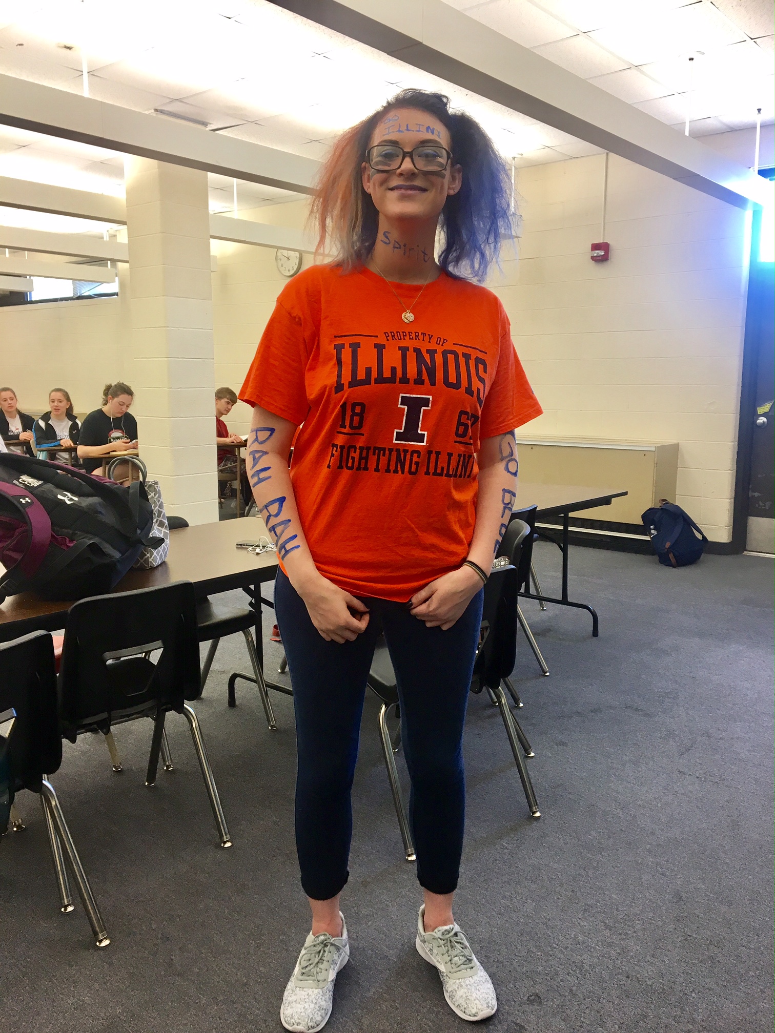 She wrote on her body slogans to support the Fighting Illini, and honestly what’s more spirited than supporting your hometown’s team? She says she used nail polish, eyeliner and regular makeup to create her spirited look.