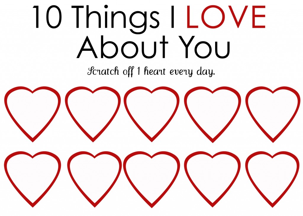 • Typed Card With the Title “14 Things I LOVE About You: P.S Scratch off 1 Heart a Day” or use the printable.