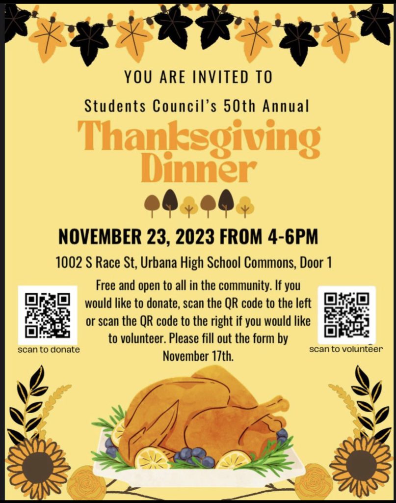 The Thanksgiving dinner is set to take place November 23rd from 4-6 PM in the Urbana High School commons. To attend, the council asks for community members to enter through door 1.